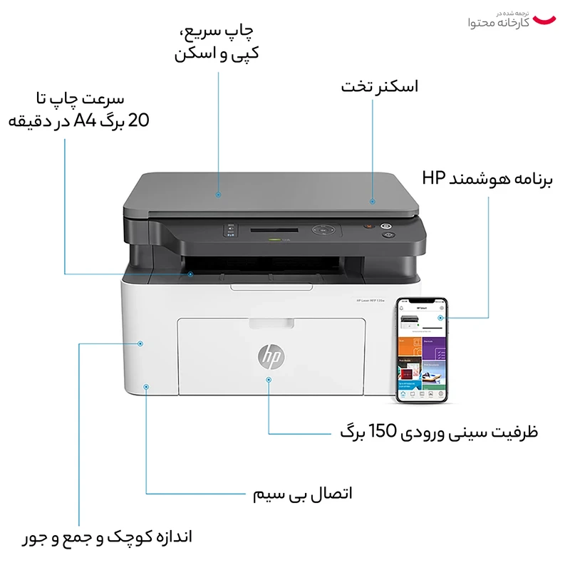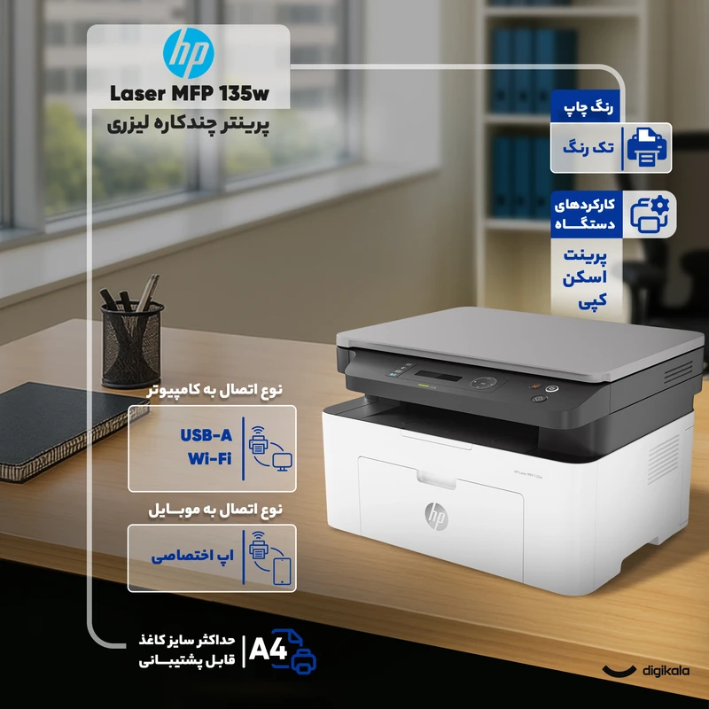 پرینتر HP Laser MFP 135w یک دستگاه چندکاره لیزری تک رنگ است که برای دفاتر کوچک تا متوسط و مصارف خانگی حرفهای طراحی شده است.