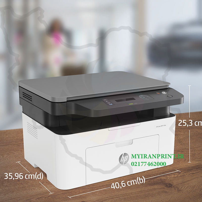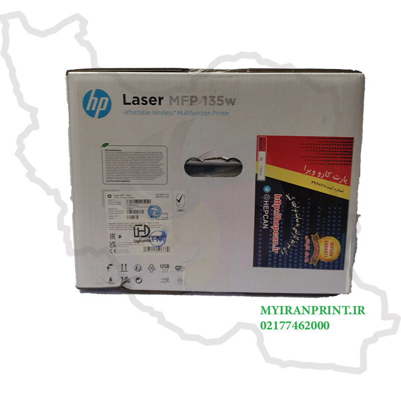 پرینتر HP Laser MFP 135w 🇮🇷 چندکاره (پرینت، اسکن، کپی) با سرعت چاپ ۲۰ برگ در دقیقه و رزولوشن ۱۲۰۰×۱۲۰۰ dpi. دارای اسکنر تخت ۶۰۰×۶۰۰ dpi، اتصال USB و Wi-Fi، حافظه ۱۲۸ مگابایت و کارتریج مشکی HP 106A/107A با کارکرد ۱۰۰۰ برگ 🖤