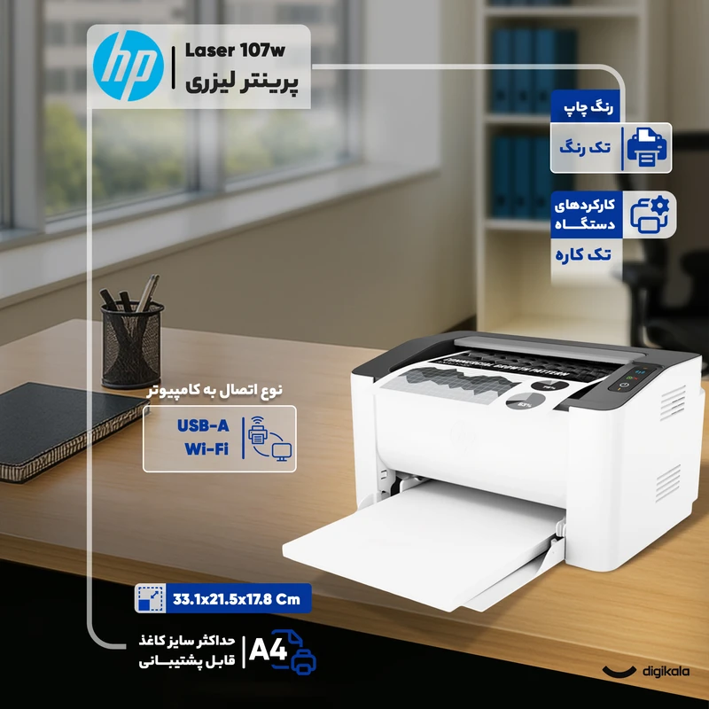 پرینتر HP Laser 107w یکی از بهترین گزینهها برای مصارف خانگی و اداری سبک است. این پرینتر تککاره و سیاه و سفید با طراحی جمعوجور، کیفیت چاپ بالا و قابلیت اتصال بیسیم (Wi-Fi) ⭐، امکان چاپ راحت، سریع و دقیق اسناد را فراهم میکند.