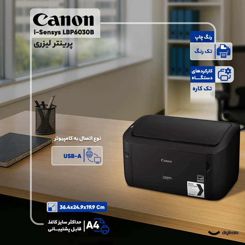 پرینتر Canon 6030 محصولی تککاره و لیزری سیاه و سفید از شرکت Canon است که برای مصارف خانگی و دفاتر کوچک طراحی شده است.
